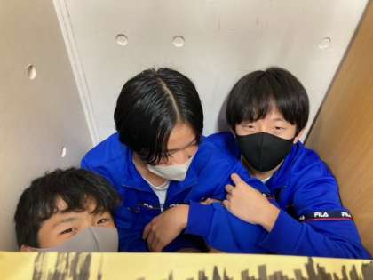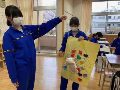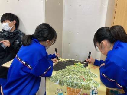 願い事を込めたメッセージの入ったオーナメント靴下を飾っている色鮮やかなクリスマスツリーが2-Bの教室で作成されています。コツコツと働く女子、作業机の影に隠れてヒソヒソしている男子、みんなクリスマスは何を願うのかな!