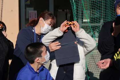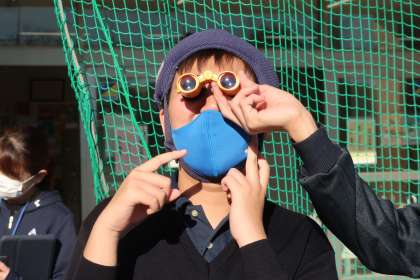 学習用タブレットのレンズ部分に太陽観察専用オペラグラスを当てて撮影をしました。タブレットを持ちながら、オペラグラスをレンズに当てて観察するのは難しかったですが