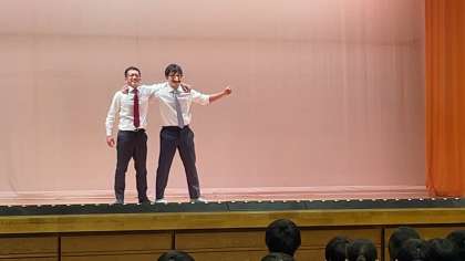 オープニングは本校の新しいお笑いコンビ「筋肉テニス」が務めました。