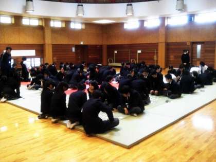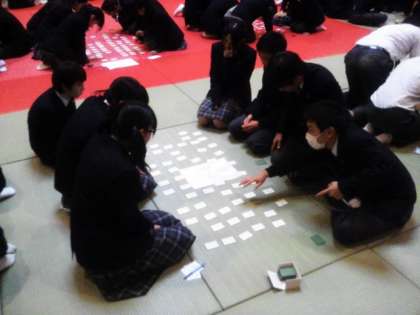 3学期恒例、百人一首大会の季節がきました。まずは1月19日(木)の午後、3年生から始まりました。武道場に敷かれた青畳にカルタを並べ、班で協力して競い合う様子は、勝ち負けを超えて、仲間と共に過ごす時間を味わうような、和気あいあいとしたものでした。緊張の受験前にホッとした午後のひと時でした。