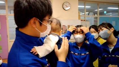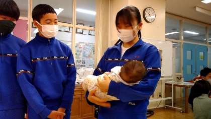 家庭科で赤ちゃんと触れ合う時間が設けられました。 赤ちゃんだっこに皆どきどきです! 小寺