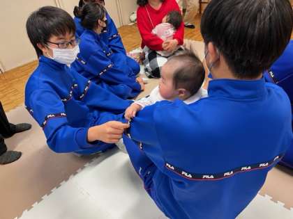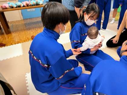 本日A組とC組で家庭科のふれあい体験を行いました。みんなの表情が優しく、始めは緊張していた人も赤ちゃんと触れ合うにつれ、笑顔でコミュニケーションをとっていました。将来のために貴重な経験をさせていただき、ありがとうございました!(松田)