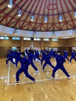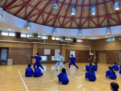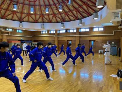 一年生の体育、本日は空手です。講師は、体育祭の演武指導でもたいへんお世話になっている岸田耕治先生です。第1回目の今日は「基本形一」を教えていただきました。みんな真剣に取り組んでいて、「えい!」という気合いのこもった声が武道場に響いていました。先生からも、覚えるのがとても早いです、と褒めていただきました。形だけでなく、武道でのお辞儀の方法や、身体の重心の意識を変えるだけで重さが変わってくることなど、武道ならではのお話を体験を通して学んでいました。