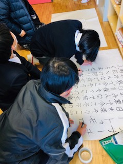 一年生は初めての経験です。有志の人たちが課題曲と自由曲の歌詞を模造紙に書き始めました。