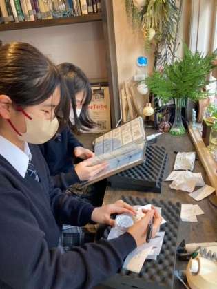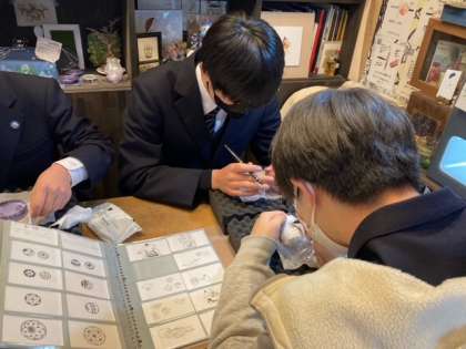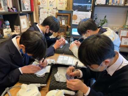 ガラスに文字や絵を彫るリューター体験をしています。手が震えながらも、真剣な表情、とっても楽しそう!