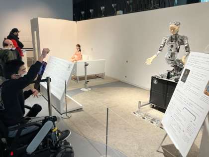 I組校外学習1班は、「未来をつくる」に来ました。 ロボットと対面中です。 郭