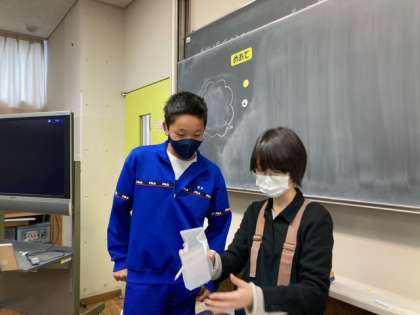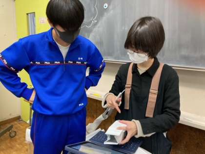 2年美術の授業、牛乳パックの平面展開紙に各自のドリンクパッケージデザインを書き写していました。各自のデザインのロゴや絵が、製品として目を引く場所にきているか、先生とマンツーマンで平面を組み立てながら再確認していました。これまでの授業で、飲み物のネーミング、コンセプト、デザインからプレゼンテーションまで、さまざまなな工程がありました。デザインの授業は、作品を作るだけでなく、アイデアをデザインするのですね。いよいよ作業は佳境を迎えています。この中から将来本当に商品化されるものが生まれたら…すごいですね!