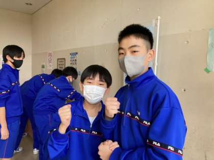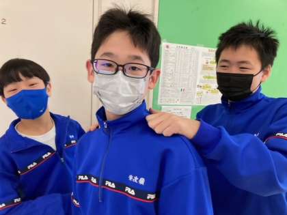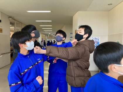 2年生男子、給食前の手洗い場でカメラを向けると、カッコいいファイティングポーズをとってくれました。ポーズのあとはいつもの優しい笑顔の男子たち、休憩時間も仲良しです。今日は45分授業で4時間のみ、午後は学年末試験に向けてしっかり頑張って!