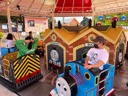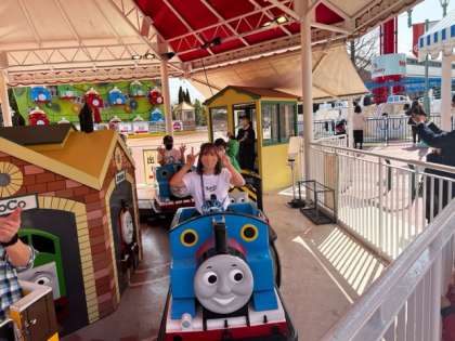 トーマスTでトーマスに乗る、ますこゆみ先生と、とよおか先生(松田)