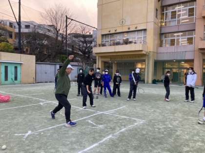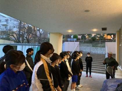 本日のソフトテニス部は、全国各地でテニス教室を長年行い、日本のソフトテニス界を牽引している重鎮のお一人、皆呂充亮(みなろみつあき)先生にお越しいただきました。バックハンドの基本を学んだ貴重なレッスン、部員たちは「楽しい、これでバックハンドが打てないなんてありえない」と、感得した様子でした。先生からは、「今日はみんなに会うのが初めてだったので、みんなに同じことを言いました。このあと、みんなが私の話を覚えてくれていたら、お互いがコーチになって私の話を復習して、技術が本当に身につくからね」と、新たな視点にたって振り返るお話も最後にしていただきました。