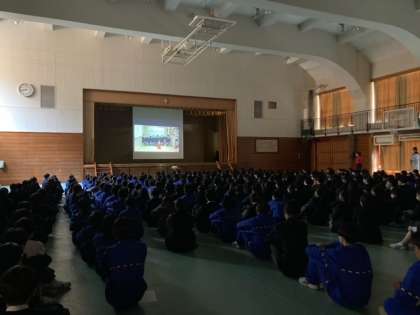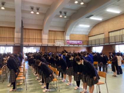 朝の全校朝礼では、生徒会作成の3年生の卒業を祝うビデオが上映されました。学校の赤いコーンが主役となったすごく面白い発想のストーリーでしたね。撮影、編集本当に大変だったと思います。おつかれさまでした。3年生もとても楽しんで観てくれていました。