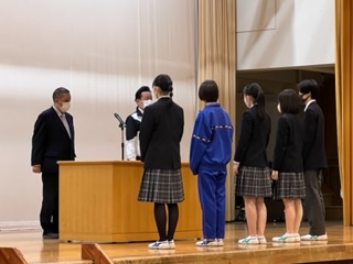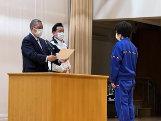 都展出品者とライフイズテックコンテストで特別賞を獲得した生徒の表彰の様子です。