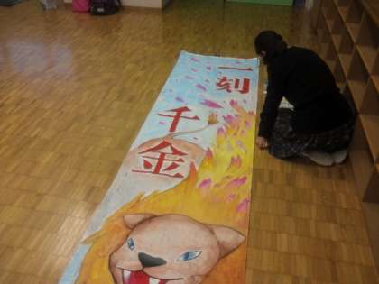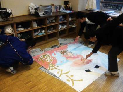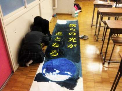 三年生の放課後の風景です。受験に向けて忙しい合間を見つけて、応援旗の修復や垂れ幕作成に取り組んでいます。