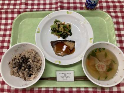 お赤飯、脂ののったぶりの照り焼き、「祝」の字の入ったなるとを入れた祝い汁、そしてジョアで卒業をお祝いします。