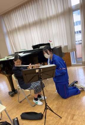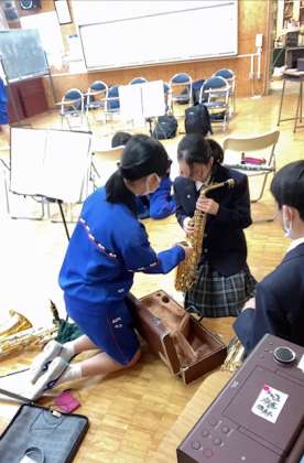 一つ一つの楽器の魅力が伝わるよう、各楽器担当の先輩たちは上手に1年生に指導します。優しく丁寧に奏法を教える姿はとても頼もしく見えました。