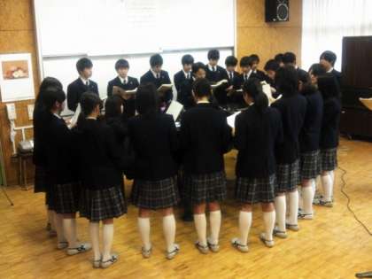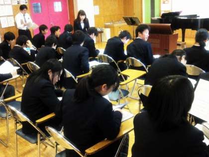 2月22日(水)5校時、音楽科研究授業が、三年生のクラスで行われました。合唱曲「大地讃頌」を四部に別れて練習し、授業の終わりにはクラスで合わせ、ハモることもできました。