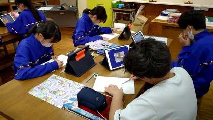 美術の授業。 「そっくり描く」ことに挑戦しています。集中力が試されますね! 小寺