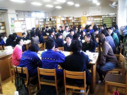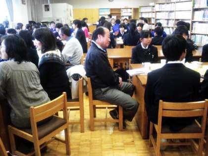 「三年生が下級生に伝えたいこと」をテーマに、PTA・生徒交流会が図書室にて開かれました。60人ほどが集まり、グループに分かれて活発に意見を出し合いました。三年生からは、受験や行事など、一生懸命頑張ってほしいとアドバイスがあり、下級生はしっかりとそのメッセージを受け継いだようでした。