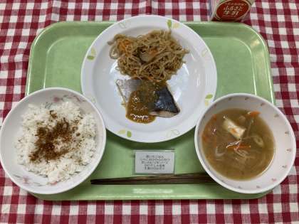 今日は、旬のアジを焼いて、豆板醤をきかせたピリ辛のみそだれをかけた「あじのピリ辛ソース」と、たっぷりの切り干し大根の煮物です。それにふりかけも付きました。