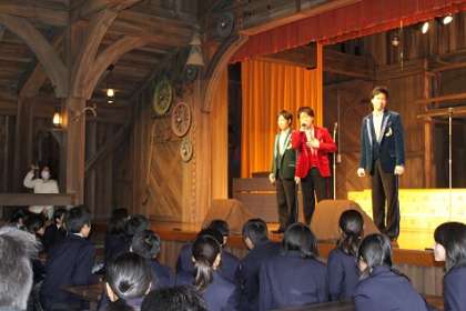 三年卒業遠足 公開日 2012/03/10 更新日 2012/03/10 できごと 3月9日(金)、三年生はディズニーランドに遠足に行ってきました。今回はパークを楽しむばかりではなく、ステージで合唱を披露するハーモニーフレンズという取り組みの一環として参加しました。学年全体で、キャストと共に「手紙」「旅立ちに日に」を歌いました。そして、クラス毎に、各クラスの合唱を披露しました。たくさんのギャラリーに囲まれての合唱でしたが、生徒たちは良い体験ができたと喜んでいました。 いいね(0)