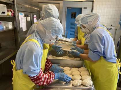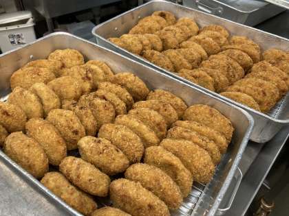 給食室では朝早くからタネを仕込み、みんなで約500個を形作って衣を付け、きつね色に揚げます。