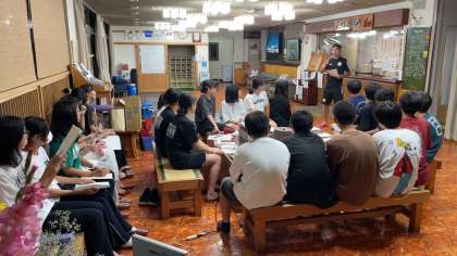 合宿での成長についての話があり、明日の流れの確認をしています。