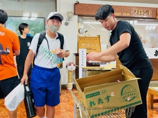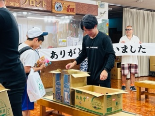 軽食を受け取ってバスに乗り込んでいます! 豊岡