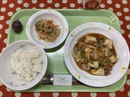 <献立> 麦入りごはん 回鍋肉 こんにゃくサラダ プルーン 牛乳