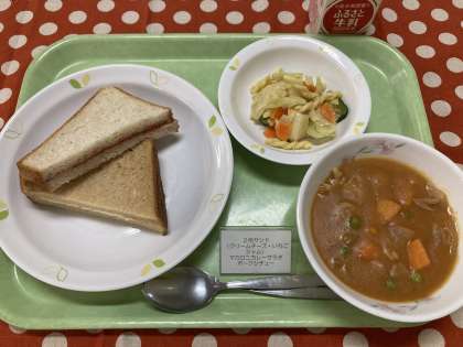 <献立> 二色サンド(クリームチーズ・いちごジャム) マカロニカレーサラダ ポークシチュー 牛乳