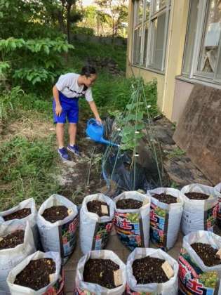 朝、水のたっぷり入った大きなじょうろ二つを手にもち、しっかりとした足取りで技術室裏の畑に向かうニ年生女子。毎朝ブロッコリー、カリフラワー、白菜、きゅうりなどの苗に水やりをしてくれています。青々とした畑の傍には、技術の授業で始まった大根の種が発芽を始めました。生命の力、育てる女子たち、朝のHIGASHIです。