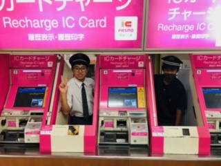 東急の駅での体験です。券売機の間から顔を出させていただきました。駅員さんの帽子も被らせていただいています。