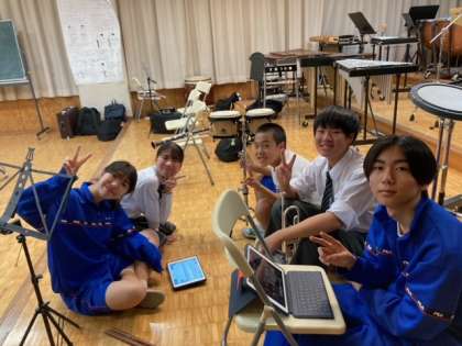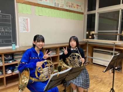 学発の演奏を盛り上げるようなMCを目指し、1年生と3年生で内容を話し合っていました。打楽器のソロパート、アレンジも決まってきたようです。金管楽器のホルンは、高音の特訓でした。みんな本番に向けて頑張っています。