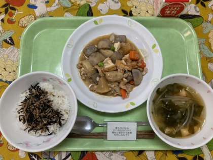 〈献立〉 麦入りごはん ひじきのふりかけ 鶏肉と里芋のうま煮 もやしのみそ汁 牛乳