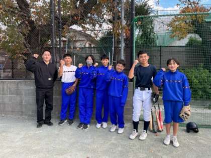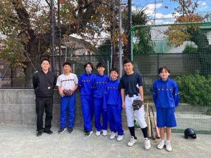 晴れ渡るお天気の午後、野球部が活動を始めるところです。少し照れながらガッツポーズ、普段の授業の時とはまた違った表情がいいですね。今日はちょっと寒いけど、体を動かしていればきっと大丈夫!頑張って!