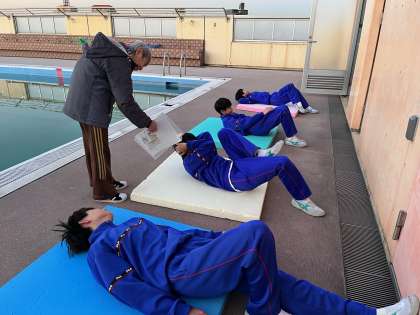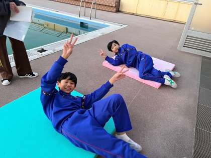 今日はプールサイドでマットを使ってストレッチをしていました!