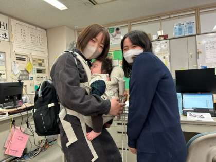 育休中の有井先生が、今日の3年生の授業「家庭科ふれあい体験」のために来てくださいました。赤ちゃん、とーっても可愛くて職員室でも大人気でした。「2年生にも会いたいなぁ」と仰っていた先生、今日は時間の都合で叶いませんでしたが、またの機会に親子共々またいらしてくださいね。