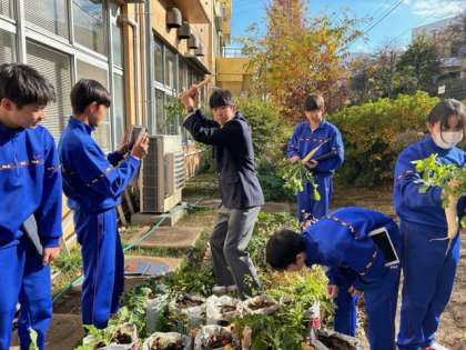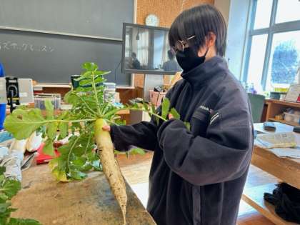 校庭の裏庭では、大根を引き抜くときの土の香り、なんだかいつもと違ってワクワクします。2Bでは、虫に喰われて3回植え直しやっと育った大根、葉っぱがとても立派だけど根の小さい大根、はたまたお店に出してもいいくらい大きな大根も育っていました。同じように育てているはずが、こんなにさまざまな形になるのが不思議ですね。