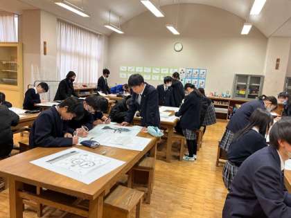冬休みの宿題だった水墨画をお互いに見ています。