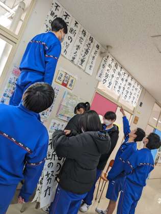 お昼休みに書き初めを廊下に掲示しました! それぞれの個性が光る書き初めです(^^)