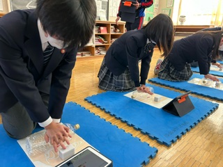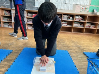 2年D組の保健体育では、心肺蘇生法の実習をおこなっていました。