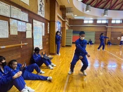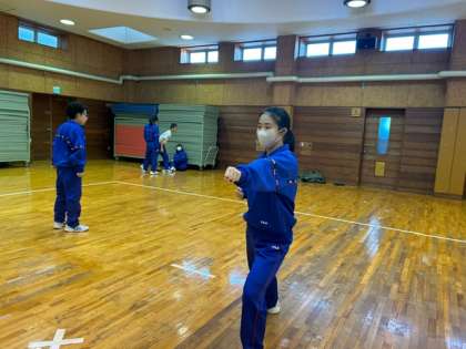 「一、二、三、四!」、とっても元気な声を出し、空手の型練習をしているのは1-C組の体育の授業です。お互いの「型」をビデオに撮り、確認しながら自主練習をしています。「みんなずっとやり続けていてすごい!」と体育の先生からもお褒めの言葉。これぞ主体的学び!