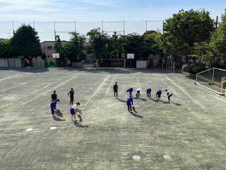 今朝早く、体育委員が校庭で一生懸命ラインを引いていました。