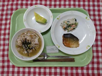 梅茶漬け さばのみりん焼き 白和え くだもの 梅茶漬けのごはんは梅を一緒に炊き込みました。