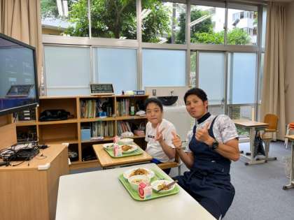 交流クラスの先生方が給食を一緒に食べに来てくれました。いつもと違い特別な感じがするようでみんな嬉しそうです。また来てほしいですね。