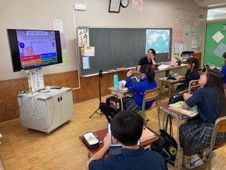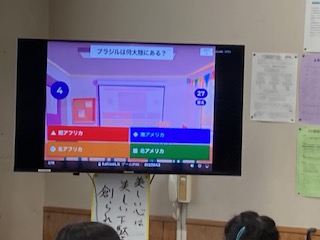 1学年の社会では、タブレットのアプリを使って生徒たちが問題を出し合っています。