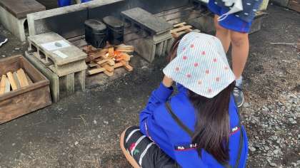 まきに火をつけています。