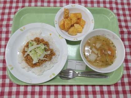タコライス 大豆と野菜のコンソメスープ スパイシーポテト 夏に食べたくなるスパイシーなメニューです。