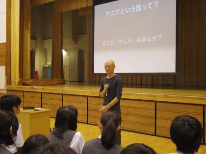 本校の卒業生である、神谷隼人さんが講師として来てくださいました。神谷さんは、本校卒業後、高等専門学校で印刷・デザインを学びました。そして、ホームページ・紙媒体の制作、制作系コンサルティングを自営にて行いました。その後、その経験を生かし、青年海外協力隊の職種PCインストラクターとして、アフリカのケニアのセカンダリースクールに配属され、コンピューターの教師として、2年間ボランティア活動をしました。神谷さんは、2年前に今後の人生、成長の中で海外経験が非常に大きな意味を持つと感じ、青年協力隊の活動で自分の力を試したいと思い、参加したそうです。