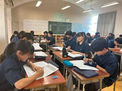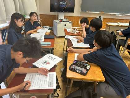 4時間目の学活では、キャリアパスポートを使って一学期の振り返りをしました。生活面、学習面、お互いの頑張りを1-Cでは班ごとに確認しているようでした。自分の頑張りだけでなく、仲間の頑張りにも気づくことができましたね。一年生の一学期、新しいことの連続だったかもしれませんが、ここまで頑張ってきました。みなさん、おつかれさまでした。これまでの成果や課題を確認して、心穏やかに明日の終業式を迎えましょう。