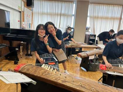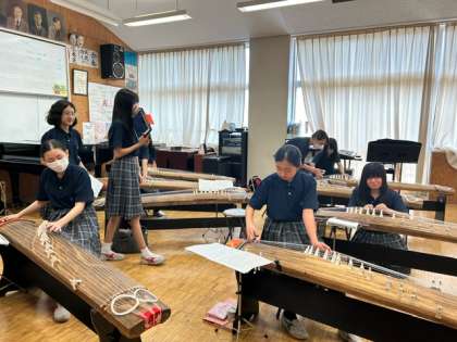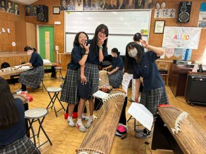 午後の音楽室、日本文化部の練習です。いま取り組んでいる曲は、名探偵コナンの映画のテーマ曲だそうです。一年生には少し難しい曲なようですが、先輩や先生にしっかりと教えていただいていました。みんな和やかで仲良しな雰囲気、「和」が伝わってきました。